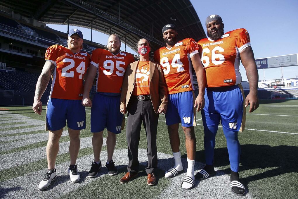 The uniforms were unveiled at a news conference at IG Field Tuesday as Bombers fullback Mike Miller, left tackle Stanley Bryant, defensive end Jackson Jeffcoat, and defensive tackle Jake Thomas modelled the new look.